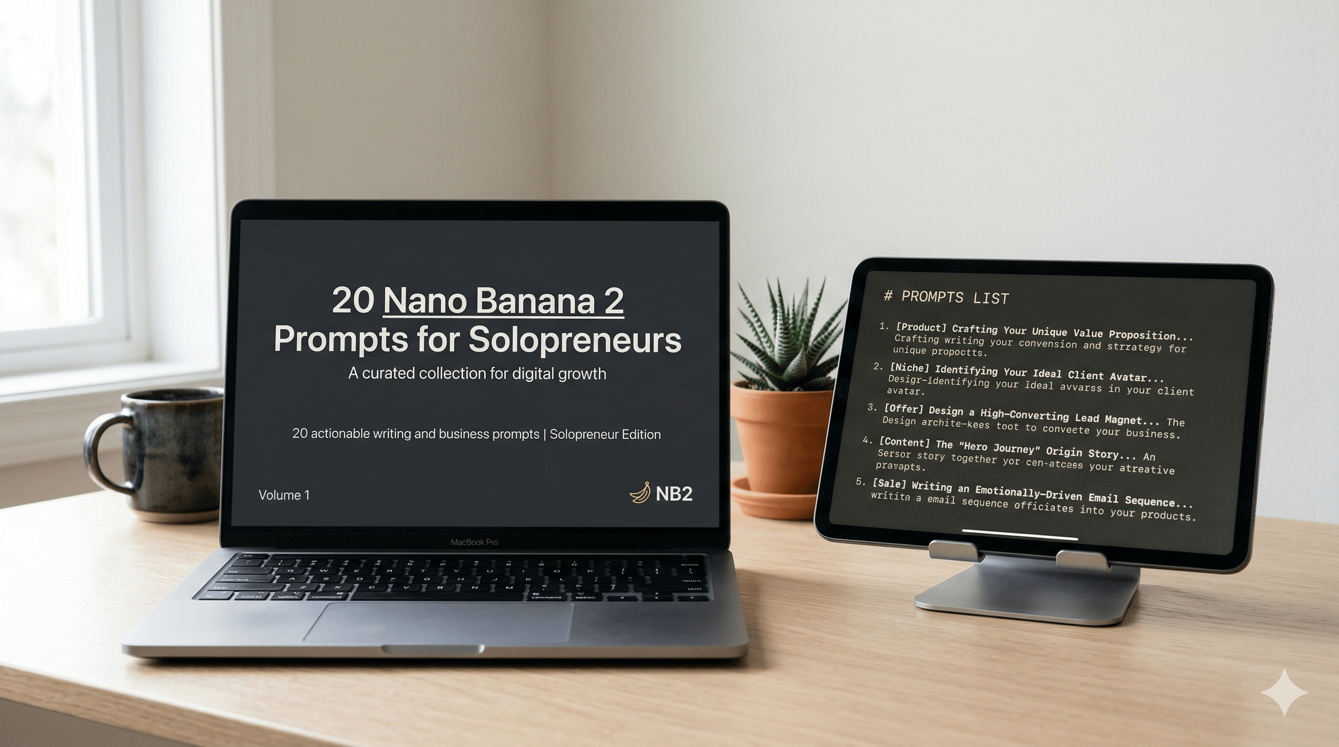 20 copy-paste prompts for every visual your solo business needs. Carousel covers, product mockups, quote cards, infographics, brand assets, and more. Built for Google's free AI image generator.